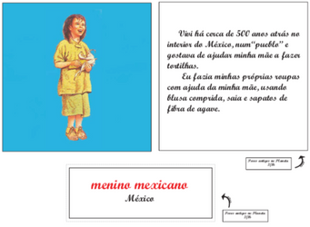 Cartão - título + Série dupla ( 9) “muda” e “falada ou escrita” de figuras avulsas de crianças com os trajes da época em que viveram + cartões com a história de cada uma dessas crianças + cartões de relacionamento + Linha do Tempo.