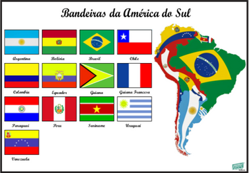 Conjunto de bandeiras pequenas da América do Sul e do Brasil e seus respectivos Cartazes A3 (2) com as bandeiras e nomes dos países para controle.